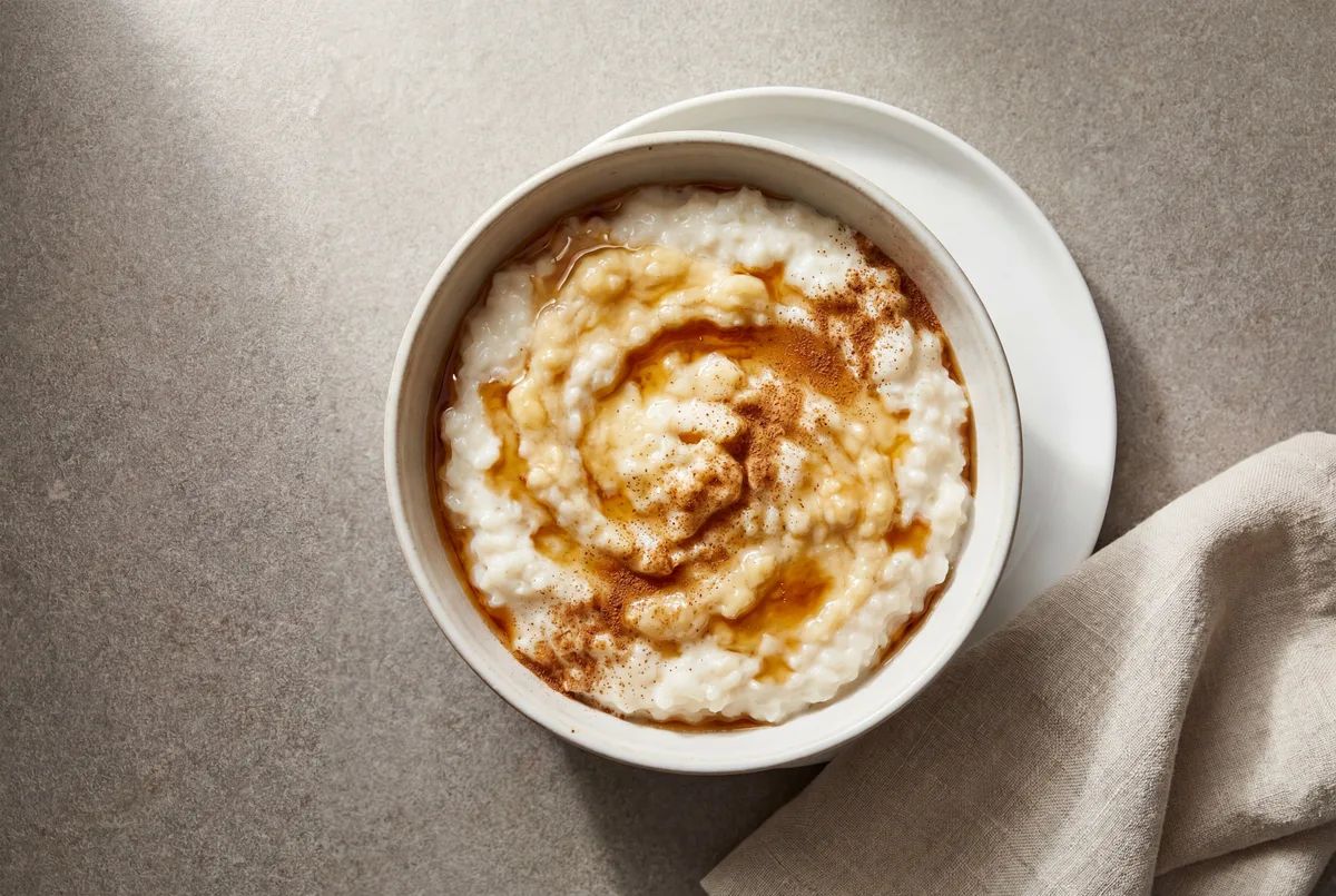 Silky white rice porridge with mashed banana. At just 1.5g fiber per serving, this gentle breakfast stays well within low-residue targets for active flares.