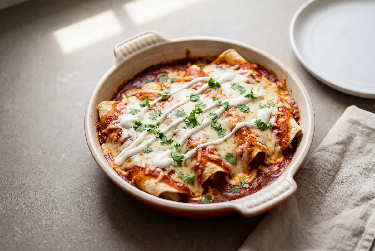 Shredded chicken rolled in corn tortillas, blanketed with mild red sauce and melted cheese. Garlic-infused oil delivers rich Mexican flavors while staying low-FODMAP friendly.