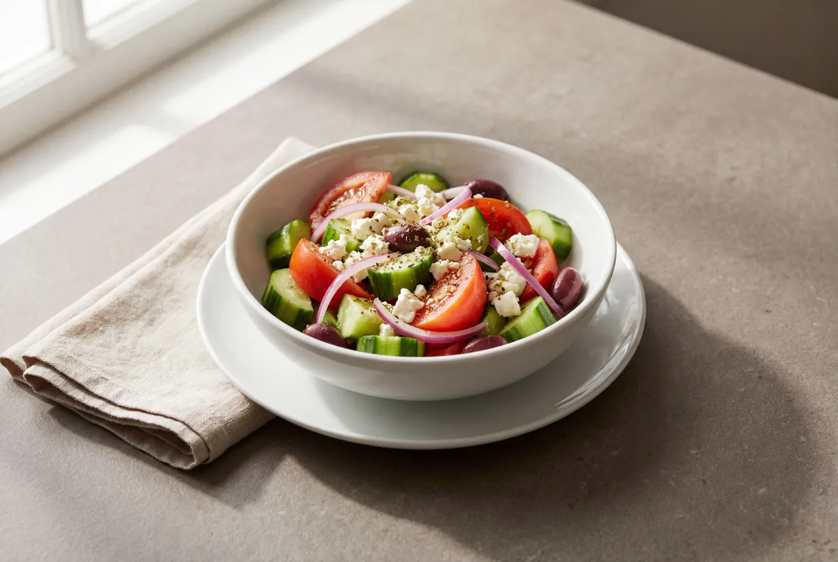 Crisp cucumber, vine-ripened tomatoes, briny Kalamata olives, and tangy feta tossed with oregano-lemon dressing. A Mediterranean staple for stable IBD periods.