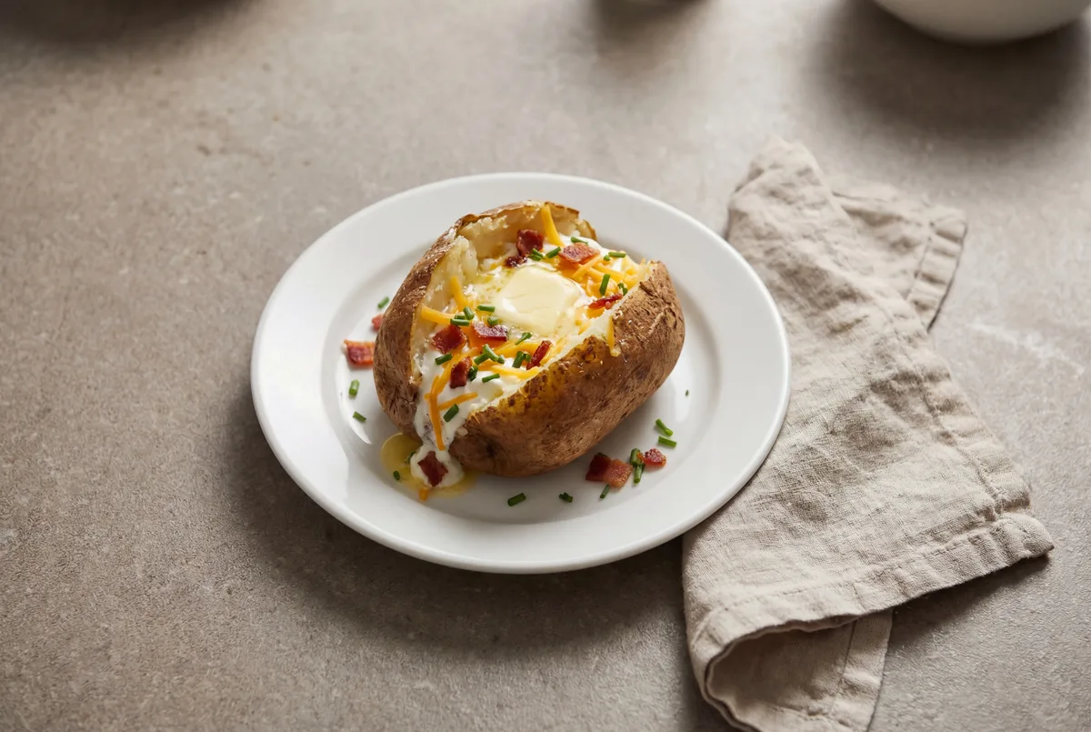 Crispy-skinned russet potato loaded with melted cheddar, bacon, and sour cream. A remission-friendly comfort classic when you can handle more fiber.