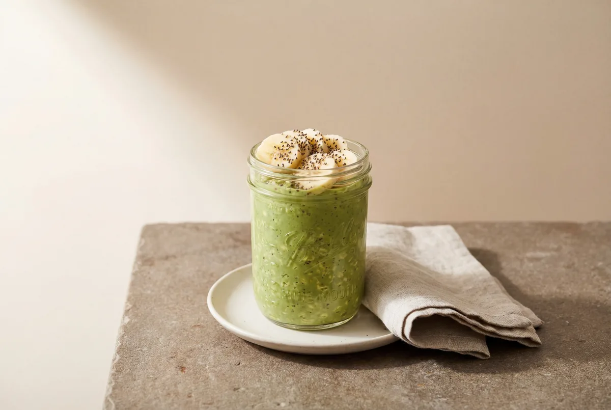 Bright green overnight oats with earthy matcha and gentle sweetness. The soluble fiber in oats may support beneficial gut bacteria during stable remission—no cooking required.