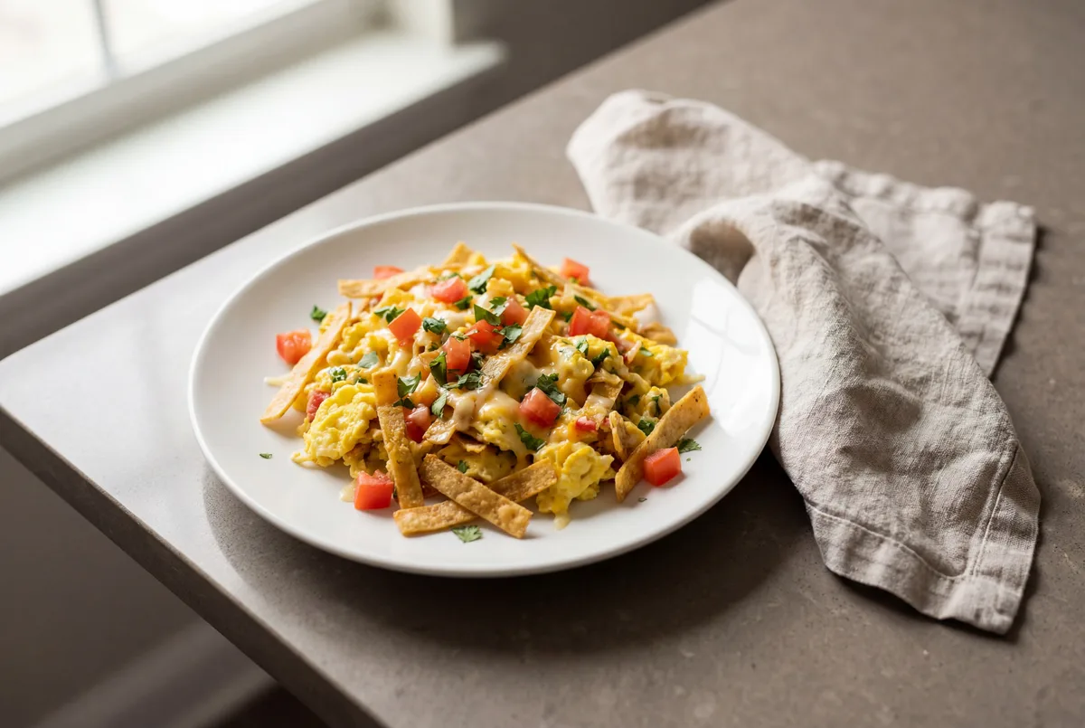 Best eaten fresh—the tortilla strips lose their texture when stored. If you must refrigerate, store eggs and any extra tortillas separately in airtight containers for up to 1 day. Reheat eggs gently in a nonstick pan over low heat, adding a splash of water to restore moisture.